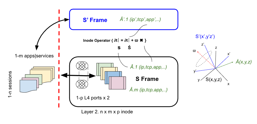 So basically we have 2 frames, frame S (our local thing we want to look after and adapt to any remote changes, it could be our customers systems, IoT device buss or networks) - in frame S we define a set of Cartesian coordinates axis - by convention labelled x, y and z. Frame S is inertial, so to us it's not moving or rotating i.e. axes are fixed in space.