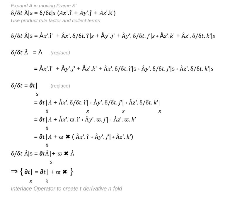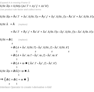 So what were trying to do is evaluate the time derivative of a vector in a rotating frame (remote network, device, application etc) and relate that remote moving time derivative to the equivalent time derivative in an inertial frame (local network/device/application etc) .